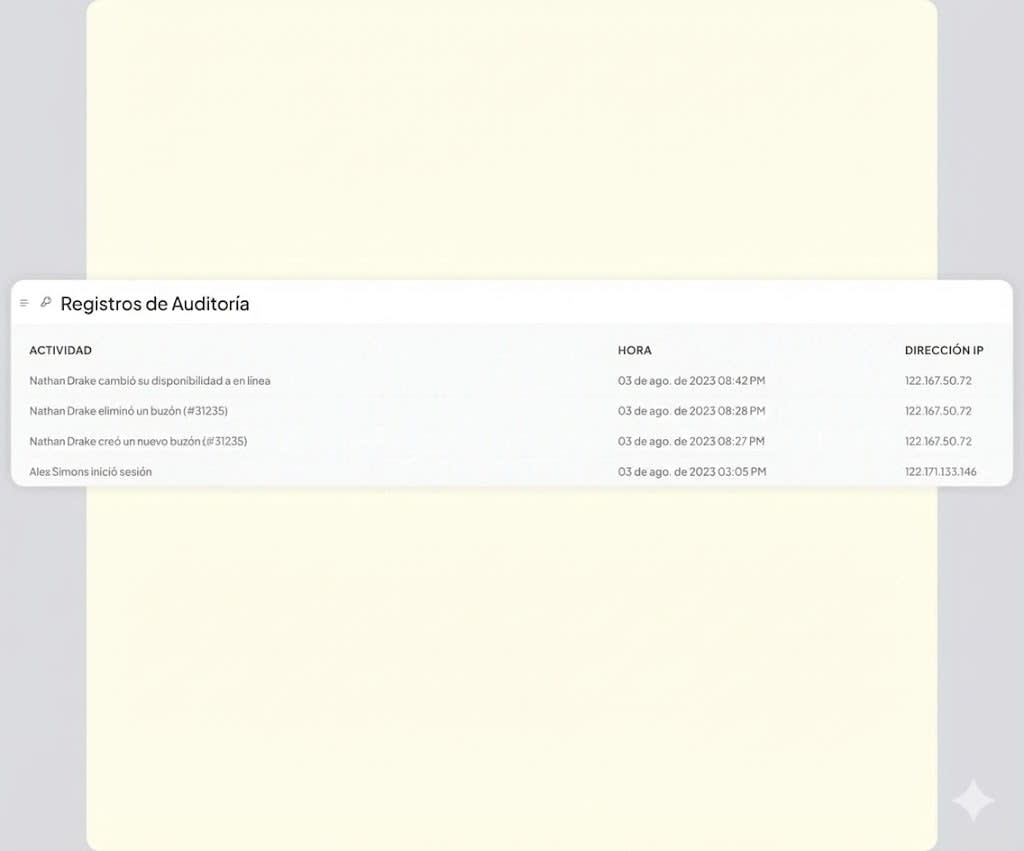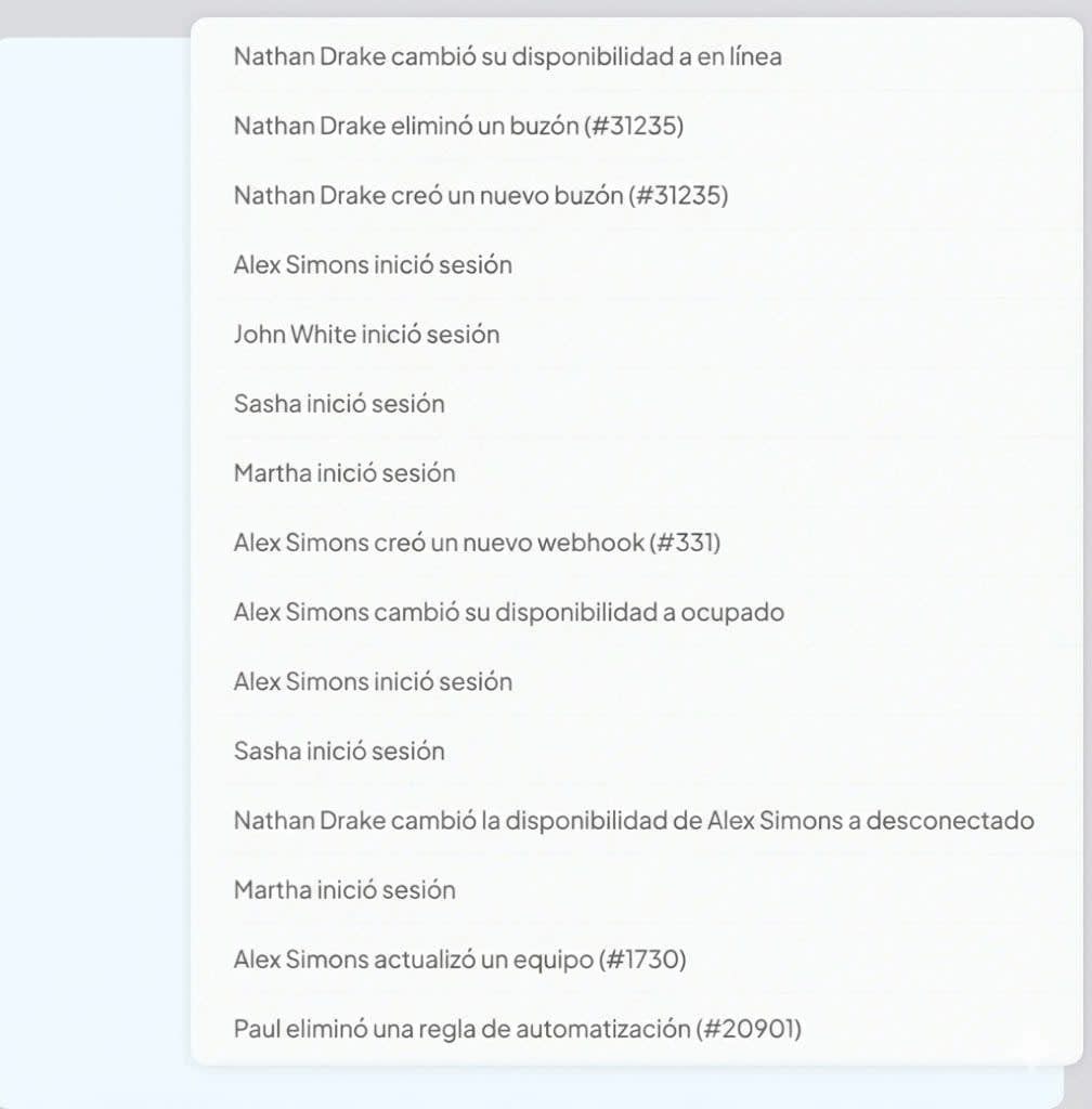 Realice un seguimiento de una variedad de actividades relacionadas con usuarios, configuraciones de cuentas o modificaciones realizadas en reglas de automatización, macros, bandejas de entrada, webhooks y equipos.